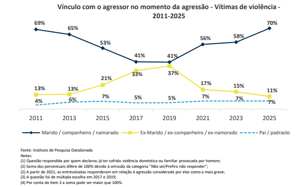 Em 2025, a relação mais comum entre agressor e vítima era afetiva (marido, companheiro ou namorado):